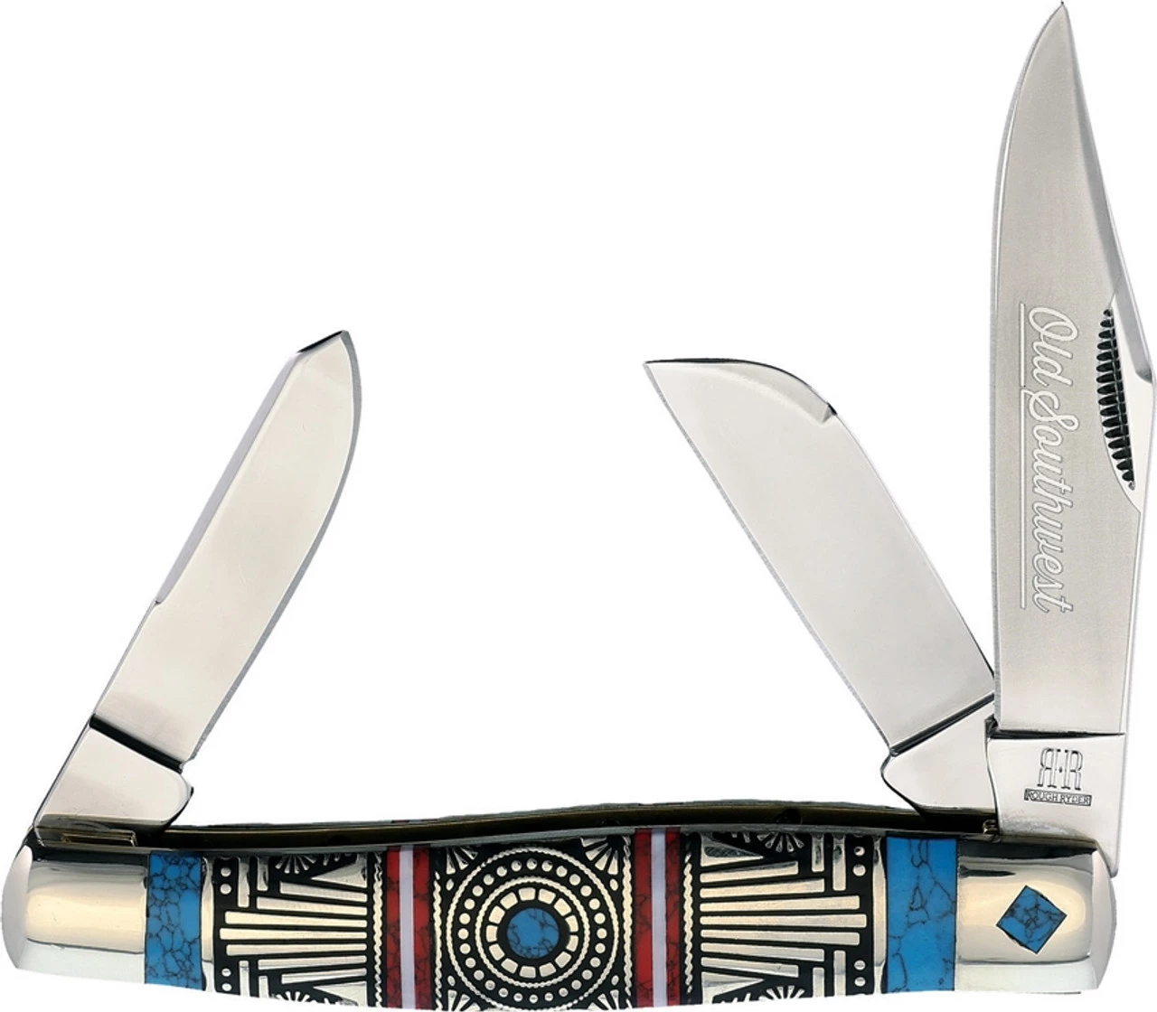 Rough Ryder Old Southwest Stockman (RR1756) – 3″ 440A Stainless Steel Clip, Spey, and Sheepsfoot Satin Blade, Red and Turquoise Southwest Style HandleÂ