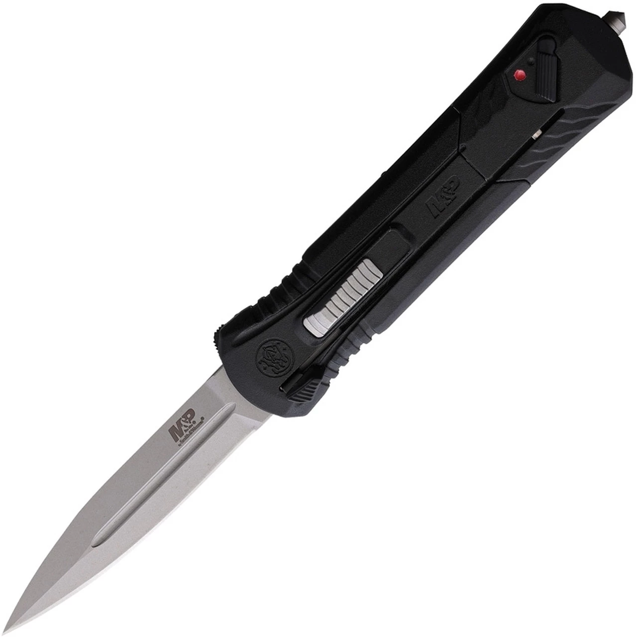 The Smith & Wesson assisted opening OTF features an ergonomic finger actuator. The Spear point blade is made of AUS-8 steel. This knife also features a glass breaker for emergency situations.