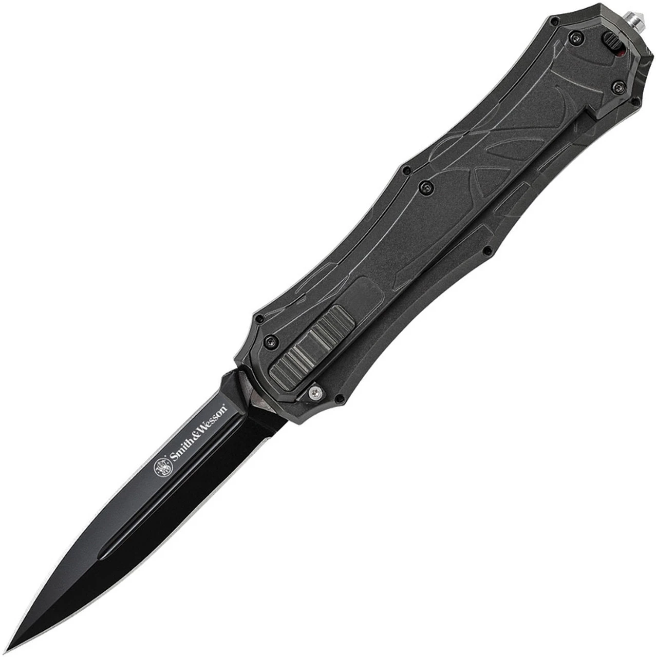 Smith & Wesson Assisted Finger Actuator OTF (Out the Front) Automatic Knife (SWOTF9B) – 3.6″ AUS-8 Spear point Blade, Black Aluminum Handle, Glass Breaker