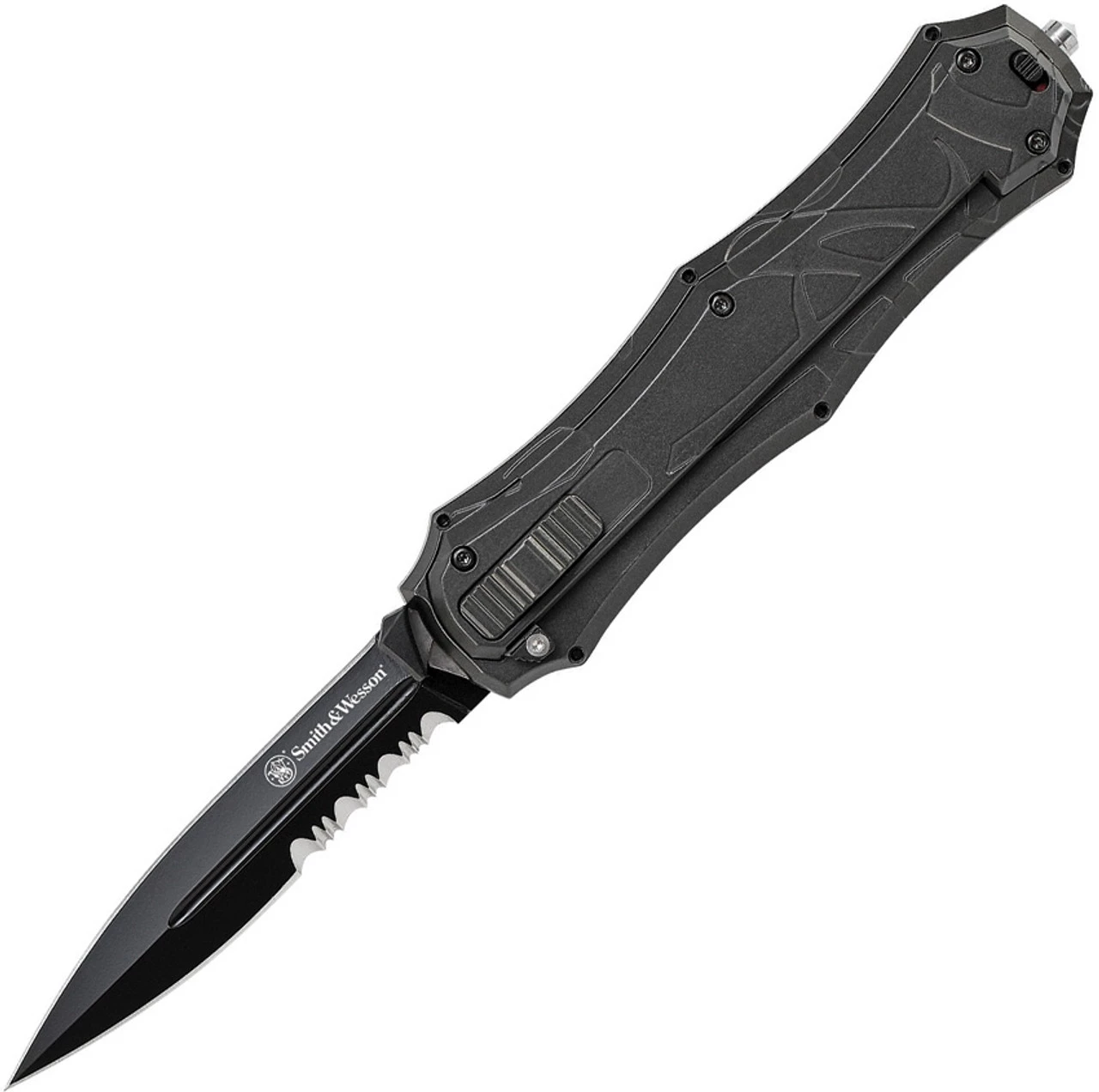 Smith & Wesson Assisted Finger Actuator OTF (Out the Front) Automatic Knife (SWOTF9BS) – 3.6″ AUS-8 Partially Serrated Spear point Blade, Black Aluminum Handle, Glass Breaker