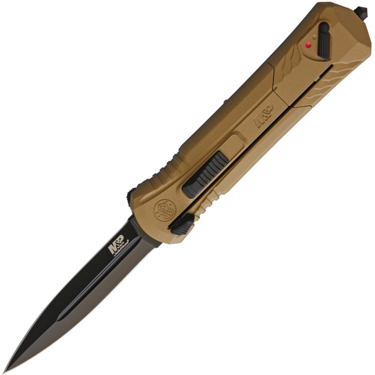 Smith & Wesson Assisted OTF (Out the Front) Automatic Knife (SW1092050) – 3.25″ AUS-8 Black Oxide Double Edge Blade, Tan Aluminum Handle, Glass Breaker