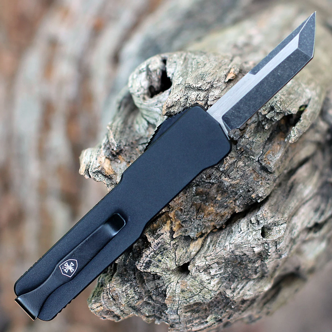Templar Knife is proud to introduce our new Premium Line of OTF’s. The Premium Lightweight series has internals re-engineered to give you a smoother dependable action. The Handle is made of 6061-T6 (Aged) Aluminum which are machined out of a solid billet giving better tolerances. The Templar Knurling on the top and bottom of the handle adds to a better grip.