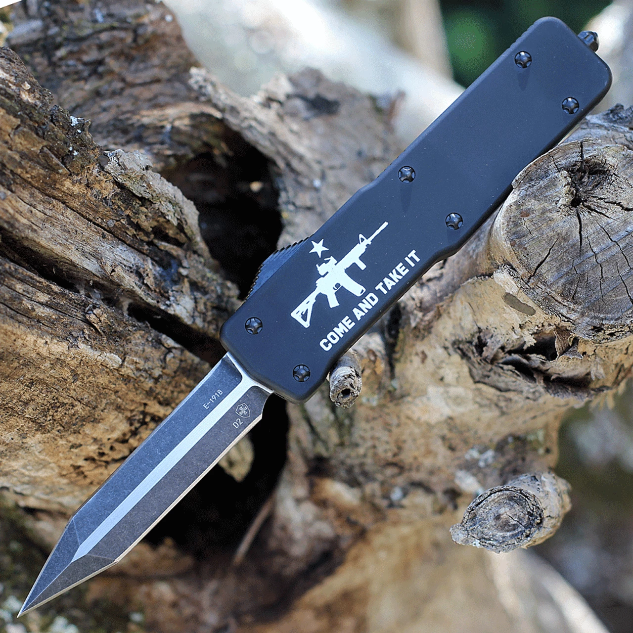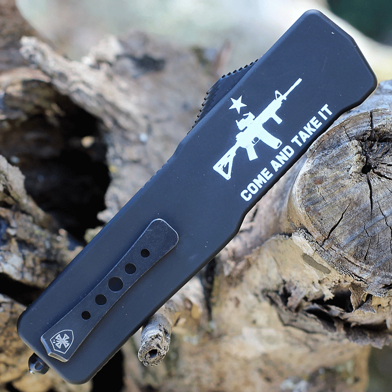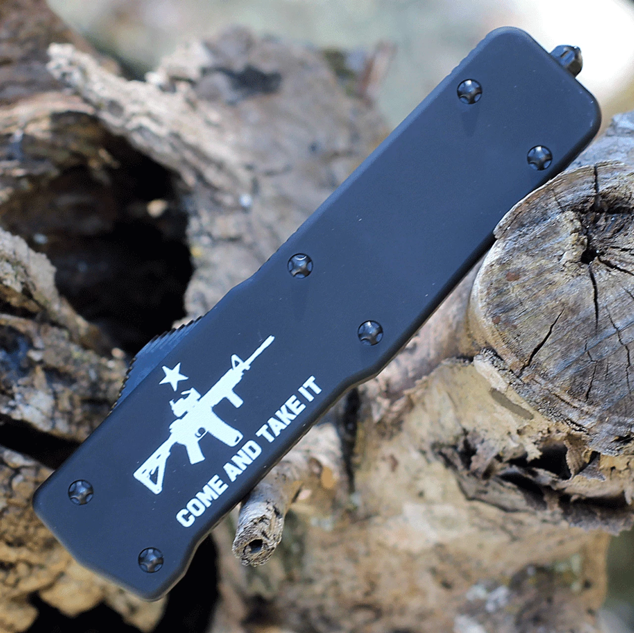 Templar Knife Premium Lightweight Series – Large OTF Automatic (LA-AR15-12-1) – 3.55″ Powder D2 Black SW Dagger, Aluminum Black “Come And Take It” W/ AR15 HandleÂ