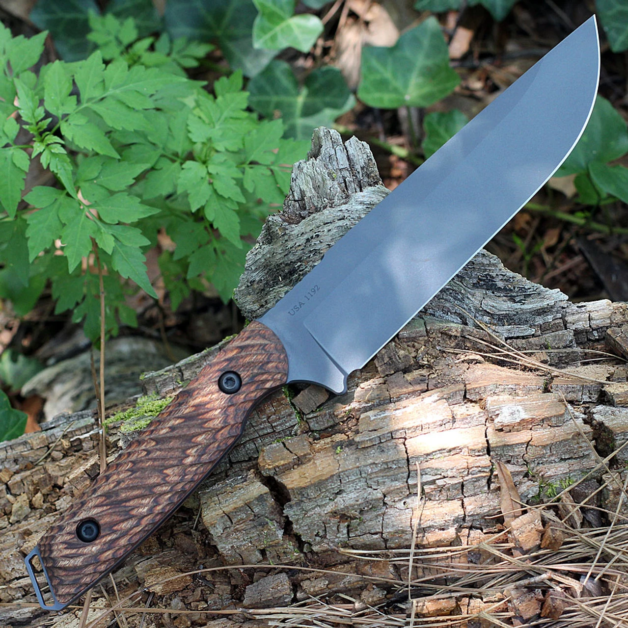 This blade shape allows for more steel mass behind the edge, which translates to a longer sharpening life and edge impact resistance. It has a food grade KG Gunkote finish, providing excellent abrasion, chemical and impact resistance. Additionally, we’ve added a perfect 90-degree spine from the tip all the way to the thumb jimping, allowing for more surface area, when hammering.