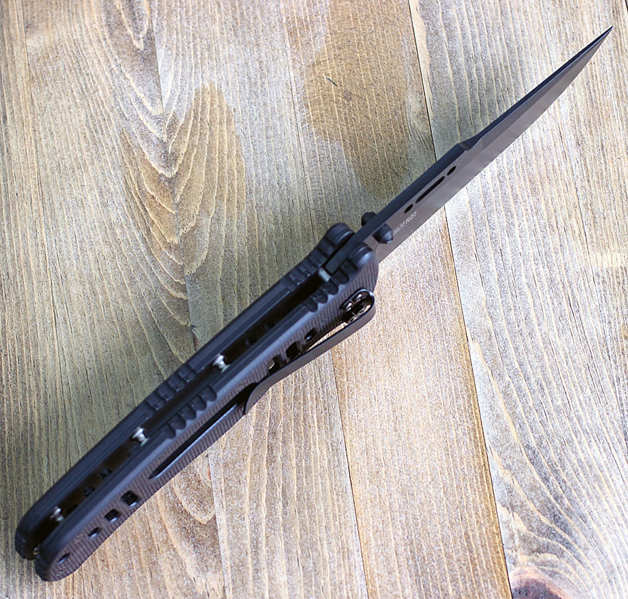 This folder model features black G-10 handle scales, a drop point style blade in a black finish and the reversible pocket clip is designed for tip down carry only.
