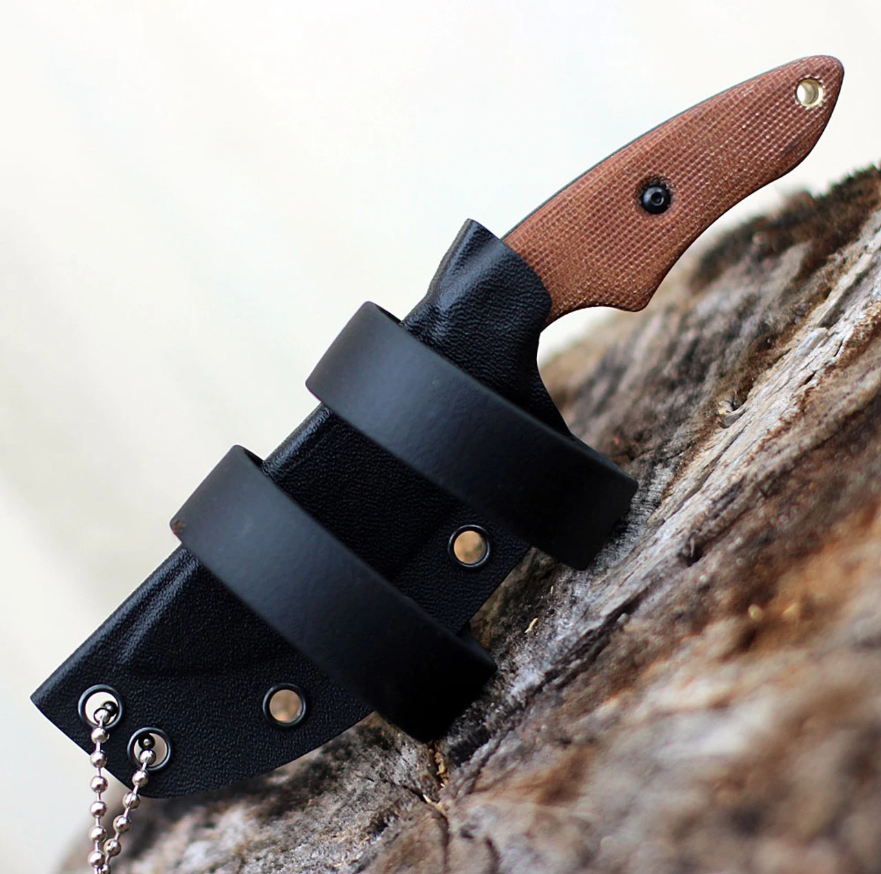 Another superb Leo-designed knife, the 3 Pointer makes for an excellent EDC, Fishing, Camping, and Hunting knife. One of the main goals with this model was options. Options for carry – it comes with beta loop straps and a neck chain, so it can be worn multiple ways. Options for personalization – it is offered with black canvas or tan canvas handles and is offered skeletonized.