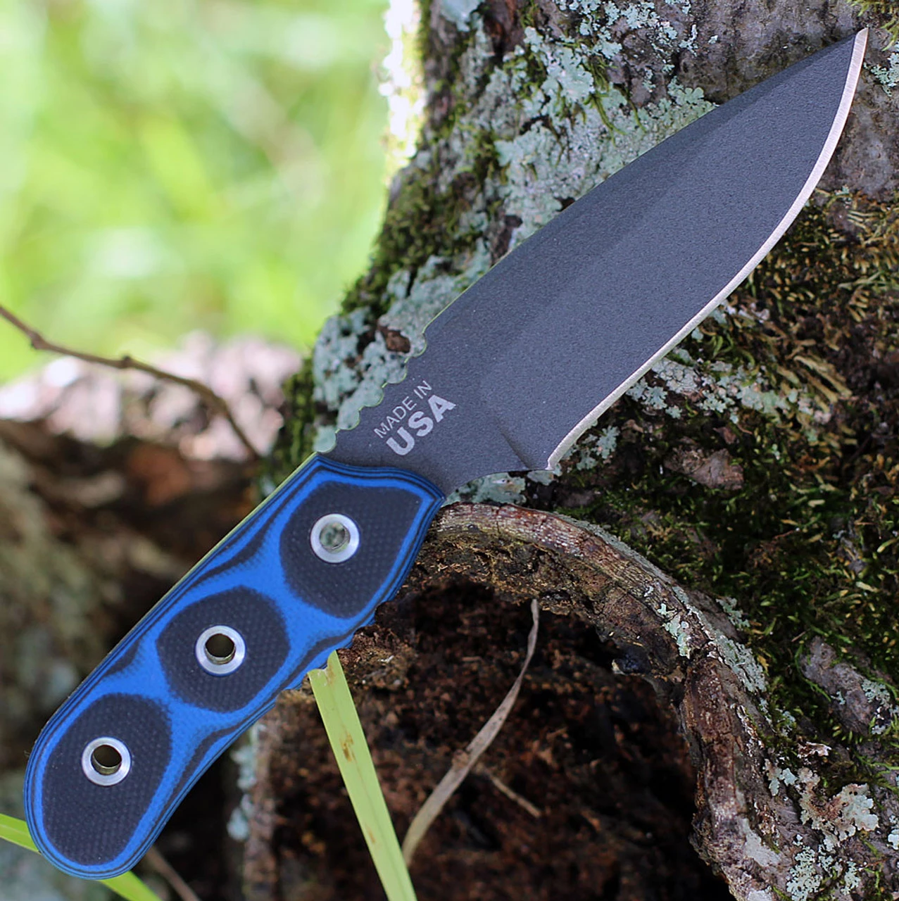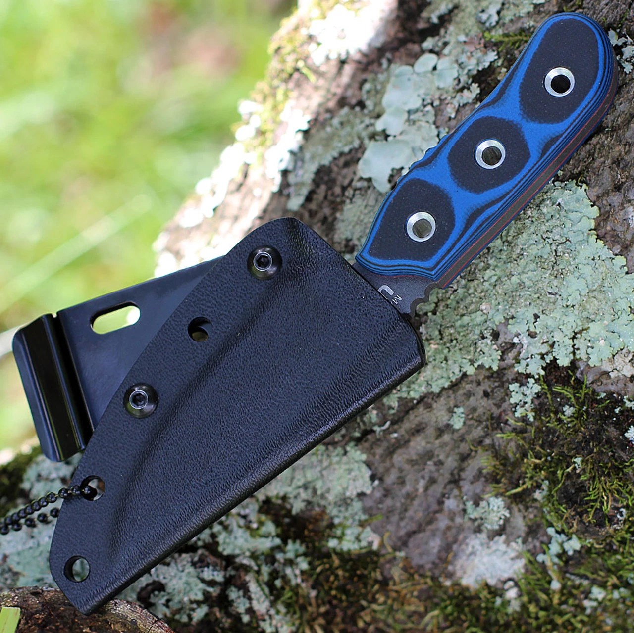At less than 7″ overall length, the Blue Otter makes an excellent EDC or companion blade. The Blue/Black G10 handle is very comfortable for its size, with jimping up top to improve your grip, and a deep choil for safety. The blade shape has a sharp, but strong tip and a slight recurve that aids in many cutting tasks.