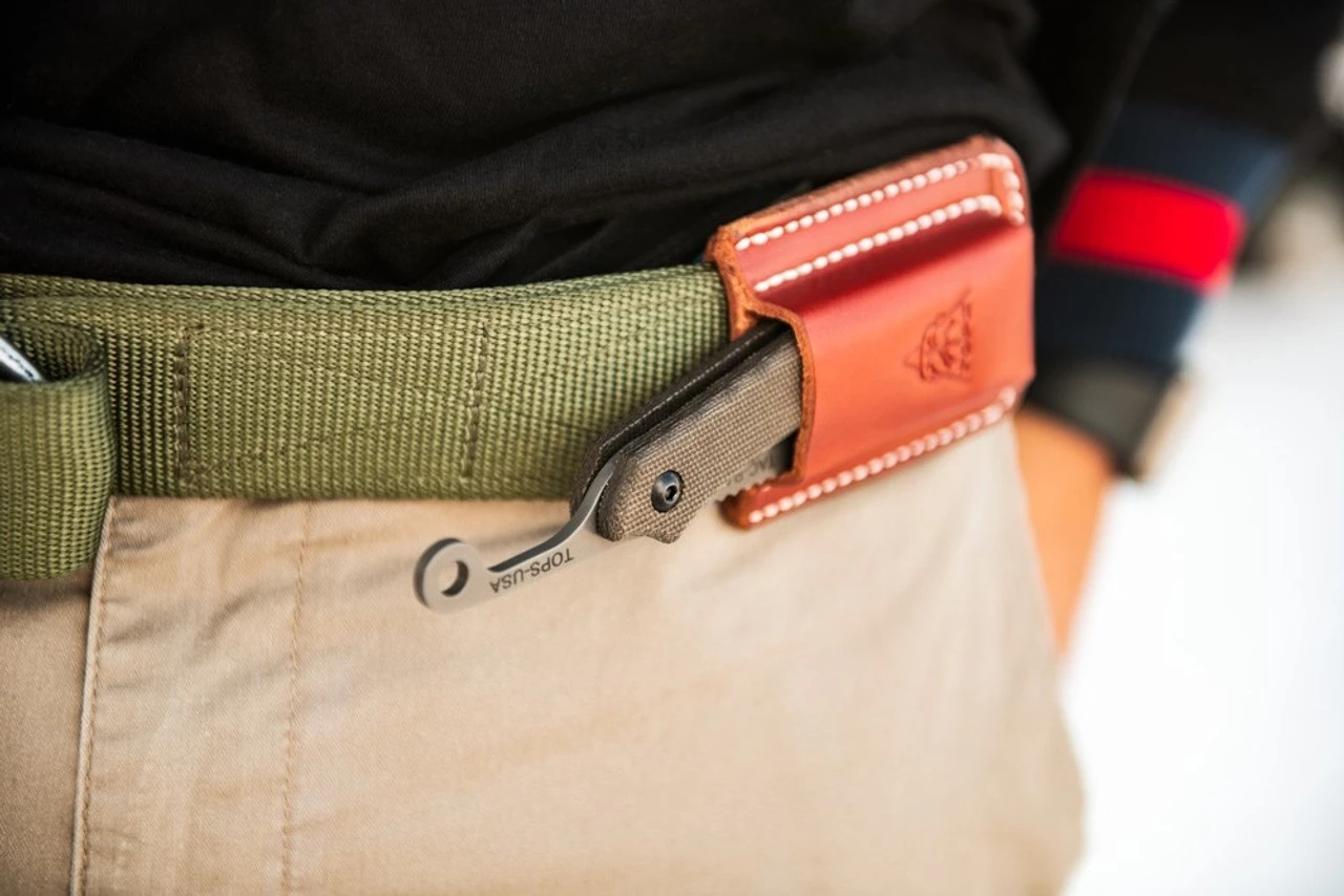 TOPS first friction folder design now has a second blade shape available. Leo wanted the Tac-Raze to fill two purposes specifically. It had to be a good-looking gentleman’s EDC that could be carried and used in public, and it had to be a functional tool. To accomplish those needs, he started with simple shapes and added curves in all the right places. Even the sheath is stylish, but also gives the wearer a variety of carry options.