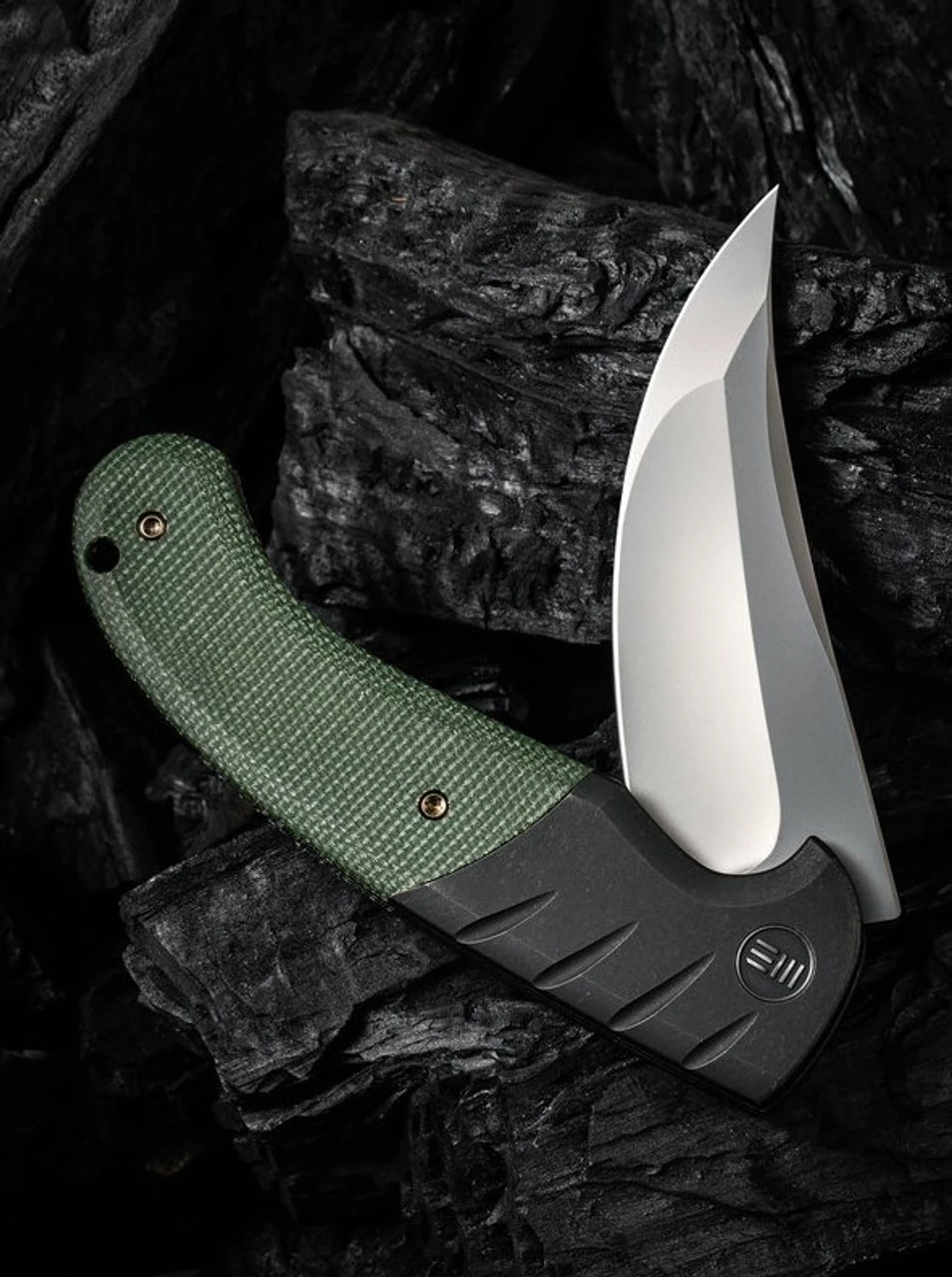 WE Knife Co. Curvaceous (WE20012-2) – 3.70″ CPM-20CV Silver Bead Blast Blade, Black Stonewashed Titanium & Green Micarta Handle