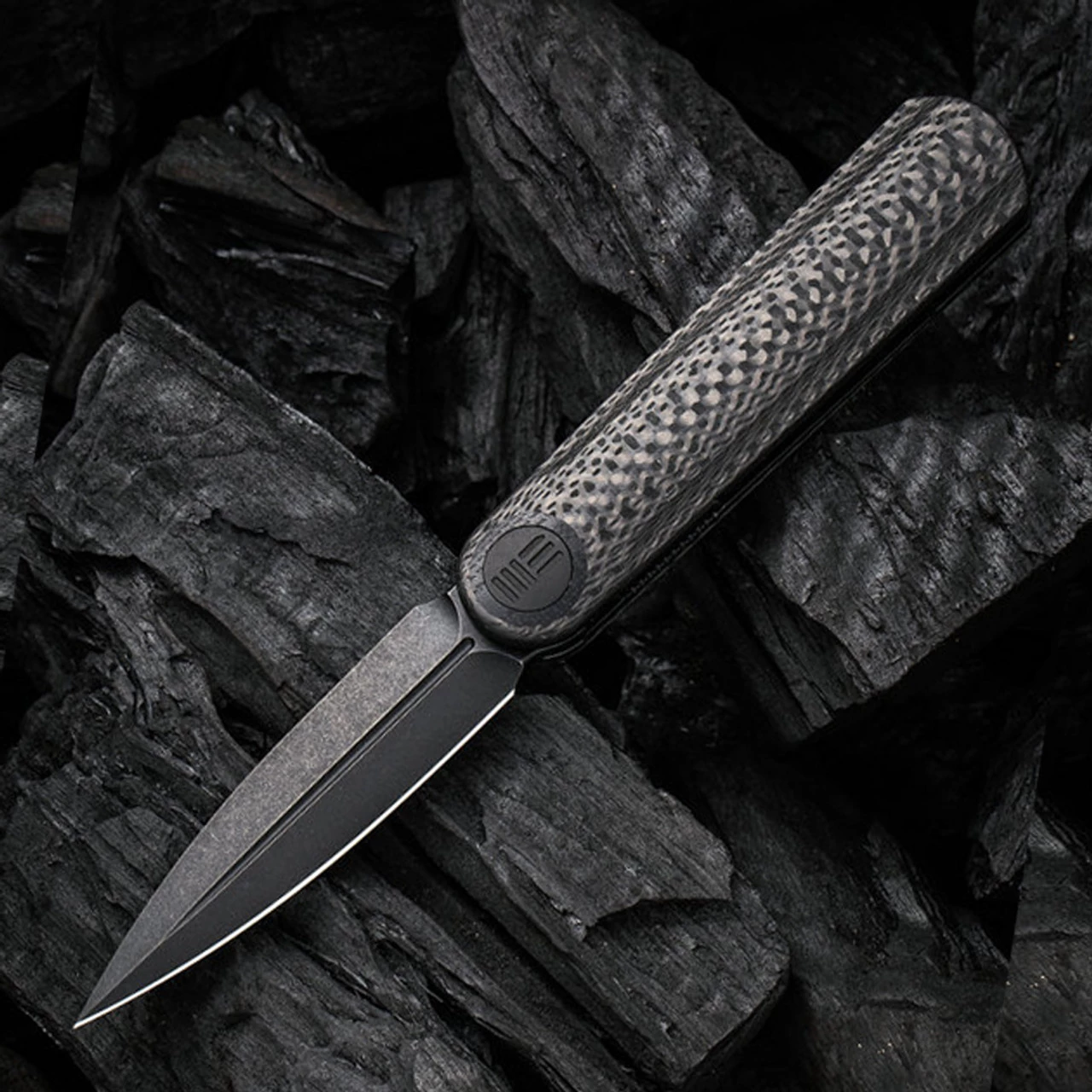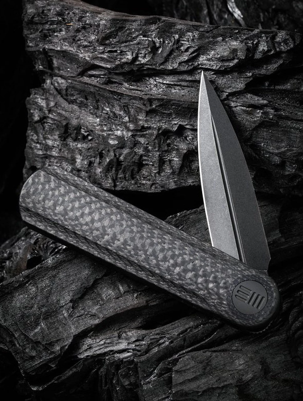 WE Knife Co. Eidolon Front Flipper (WE19074B-C) – 2.9″ CPM-20CV Black Stonewashed Dagger Blade, Black Twill Carbon Fiber HandleÂ