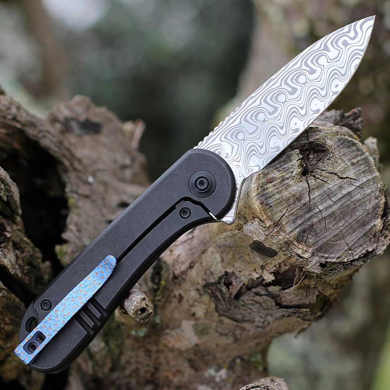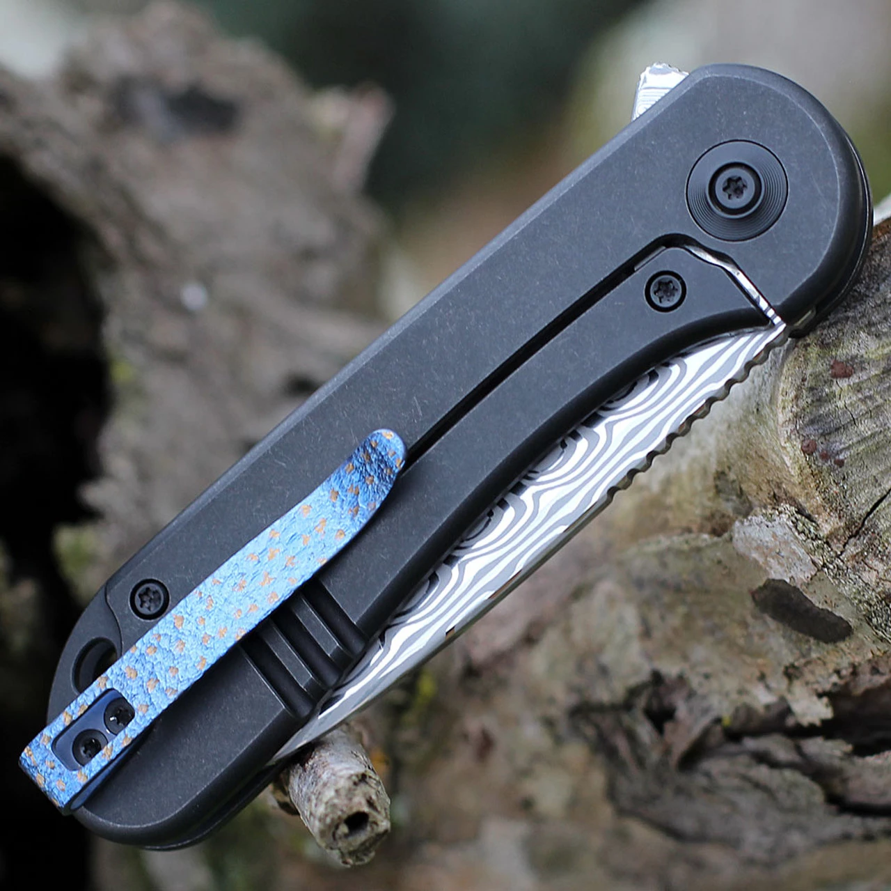 WE Knife Elementum Frame Lock (WE18062X-DS1) – 2.96″ Hakkapella Damasteel Drop Point Blade, Black Titanium Handle Â