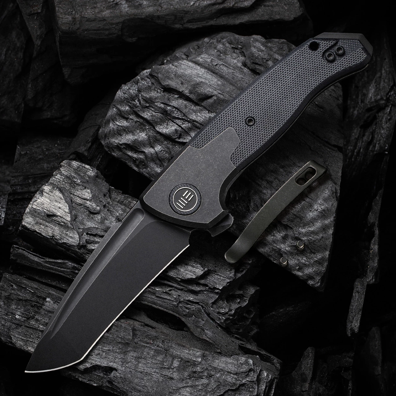 WE Knife Press Check Frame Lock (WE20078A-1) – 3.15″ CPM-20CV Black Stonewash Tanto Blade, Black Titanium with Black G10 Handles