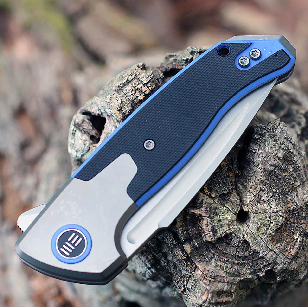 WE Knife Press Check Frame Lock (WE20078B-2) – 3.15″ CPM-20CV Silver Bead Blast Drop Point Blade, Gray Titaniukm with Blue & Black G10 Handles