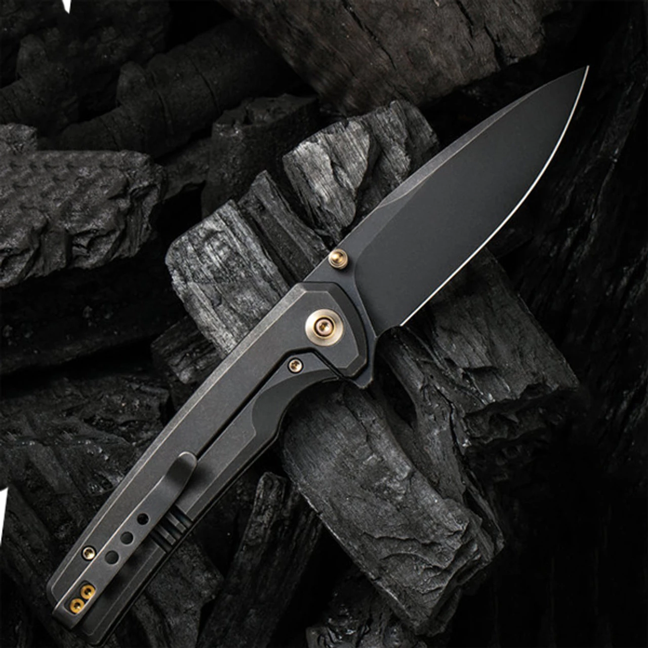 WE Knife Co. Subjugator Frame Lock (WE 21014C-5) – 3.48″ CPM 20CV Black Stonewashed Drop Point Blade, Black Titanium Handle