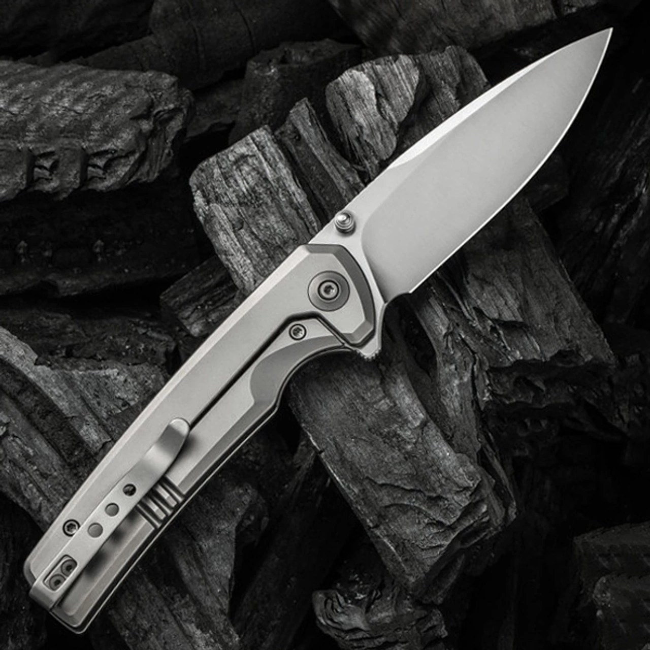 WE Knife Co. Subjugator Frame Lock (WE 21014C-1) – 3.48″ CPM 20CV Satin Drop Point Blade, Gray Titanium Handle