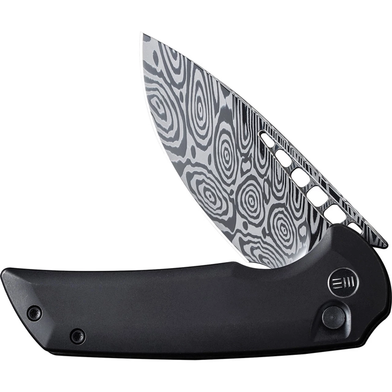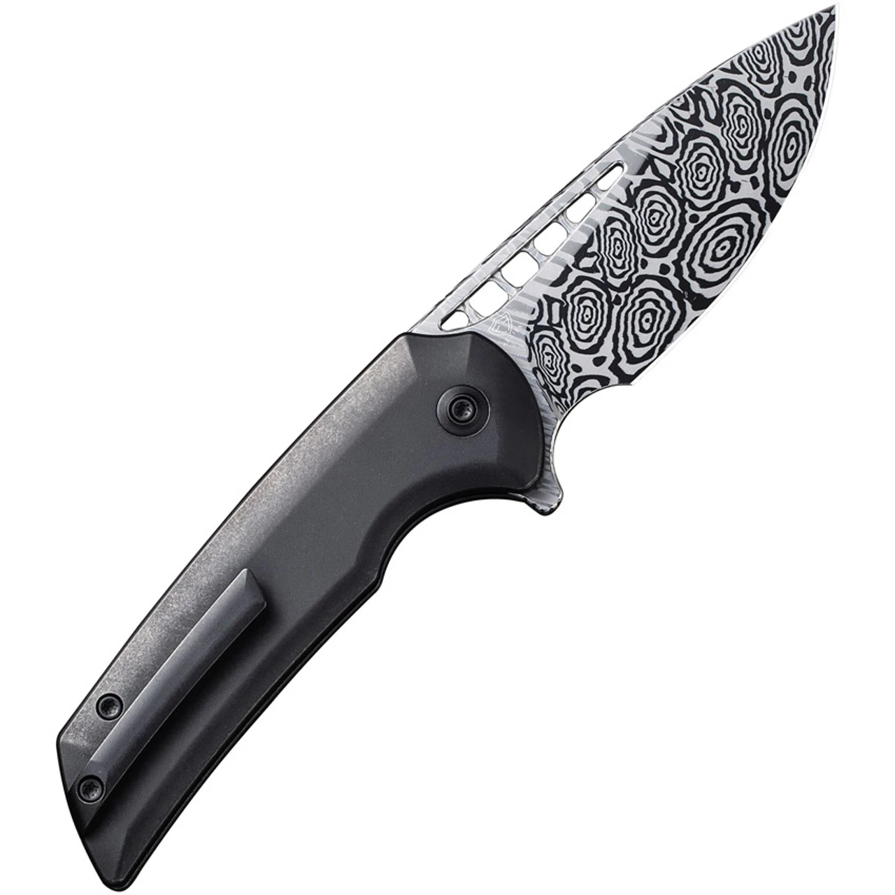 WE Knife Mini Malice Button Lock Flipper( WE054BL-DS1) – 2.98″ Heimskringla Damasteel Drop Point Blade, Black 6AL4V Titanium Handle
