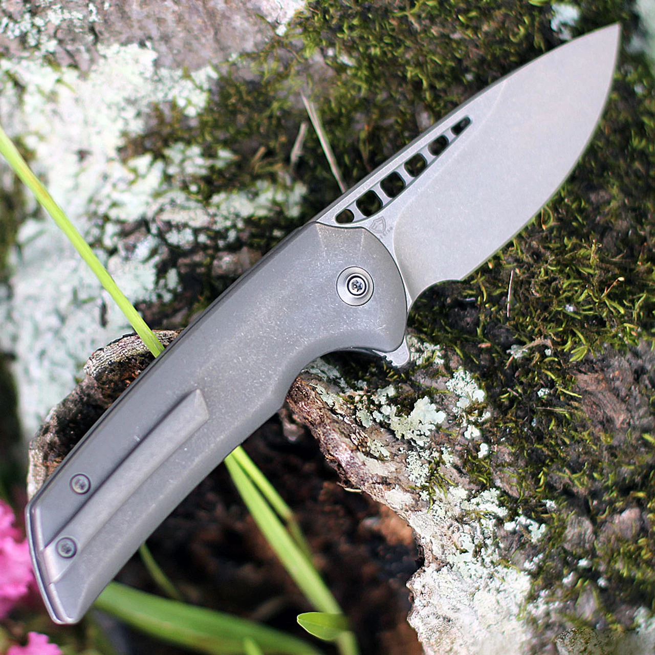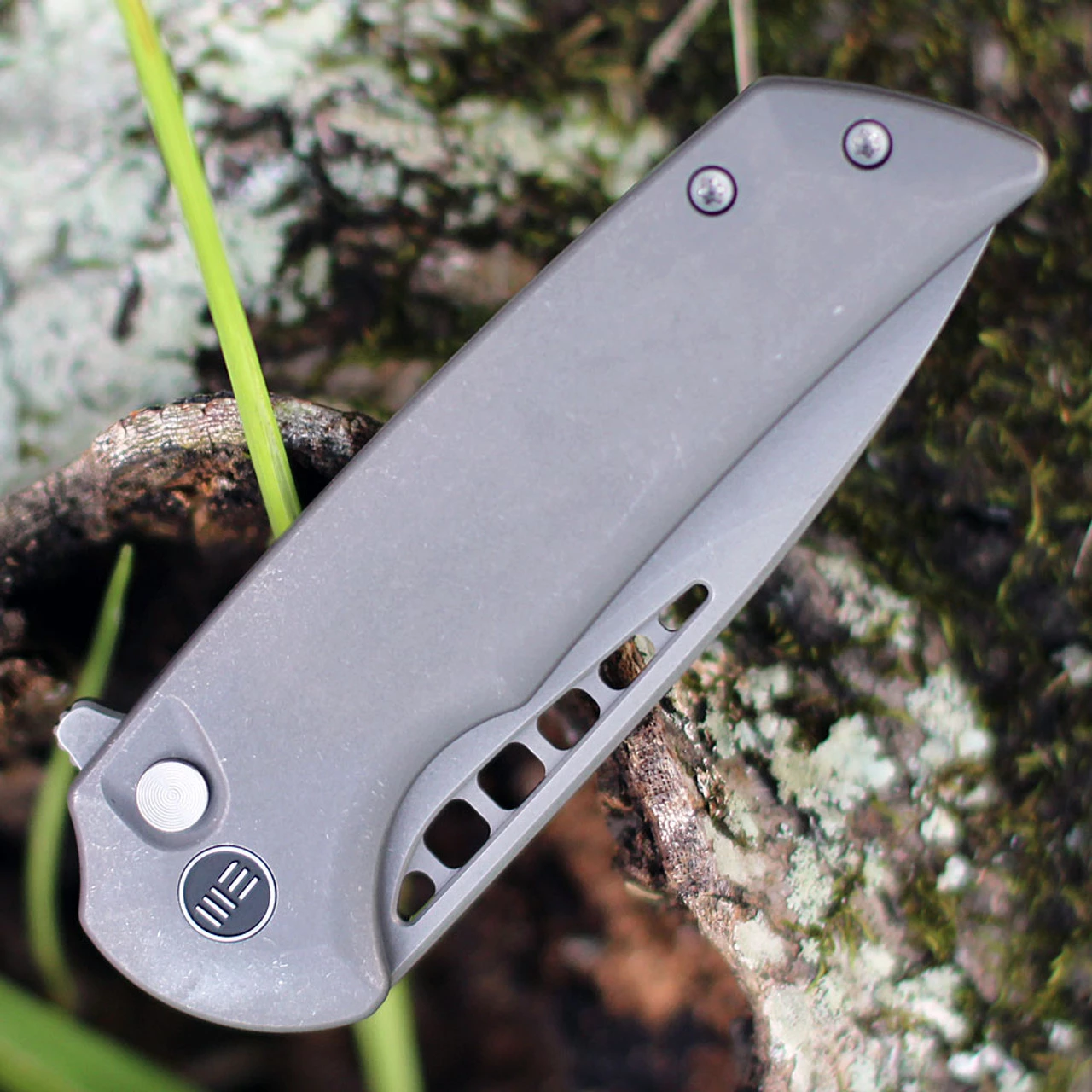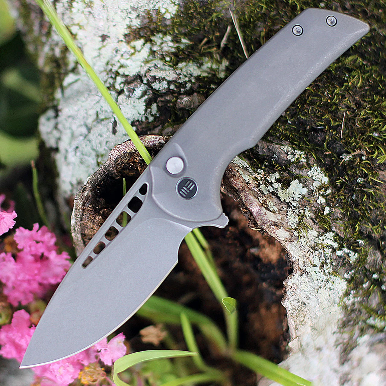 WE Knife Mini Malice Button Lock Flipper( WE054BL2) – 2.98″ Gray Stonewash CPM 20CV Plain Blade, Gray Titanium Handle