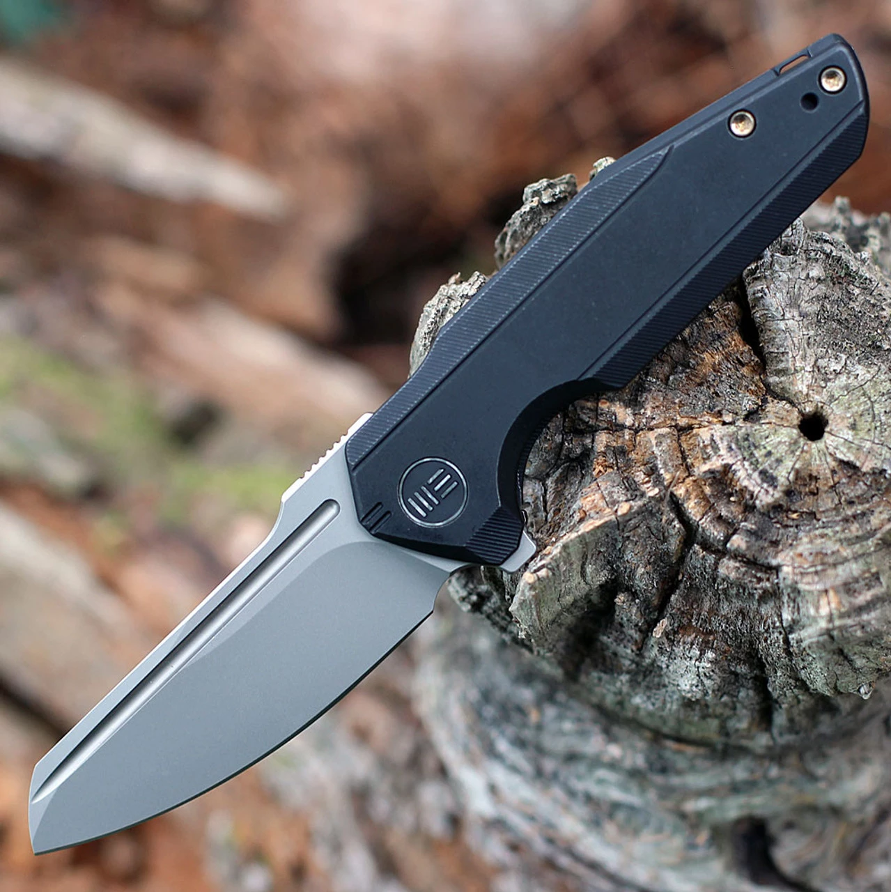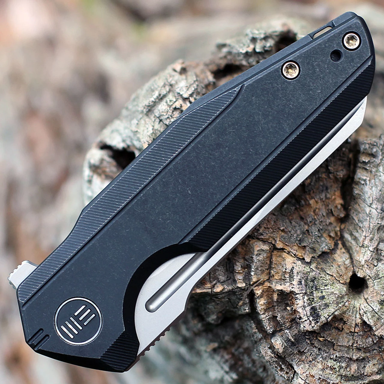 WE StarHawk Flipper Knife (WE21017-3) 2.81″ CPM-20CV Silver Bead Blasted Modified Sheepsfoot Plain Blade, Black 6AL4V Titanium Handle